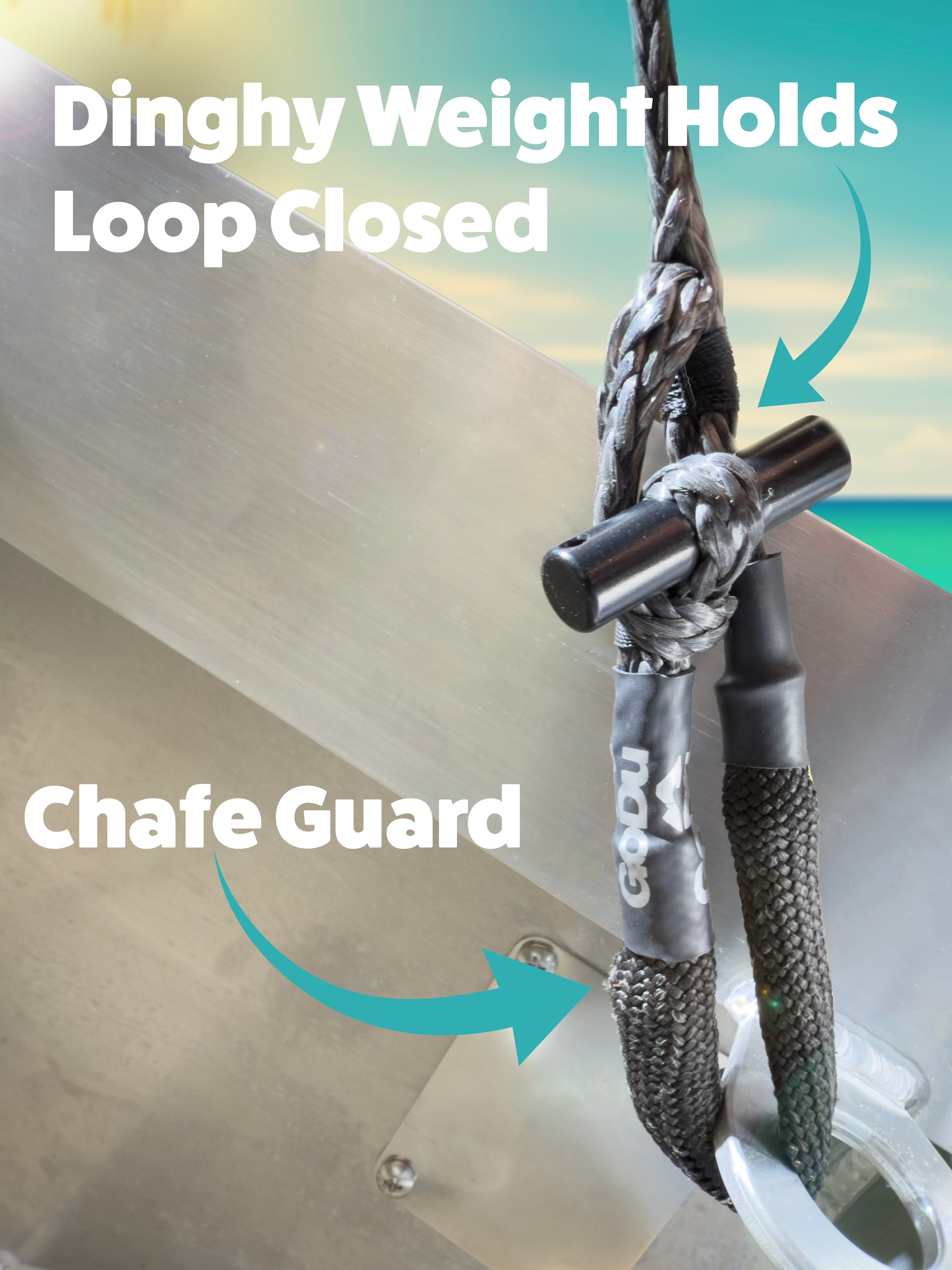 Between the Dyneema line, the loop, the chafe guard, and anodized aluminum dogbones... you have a dinghy sling solution that won't rattle, rust, and chafe away.